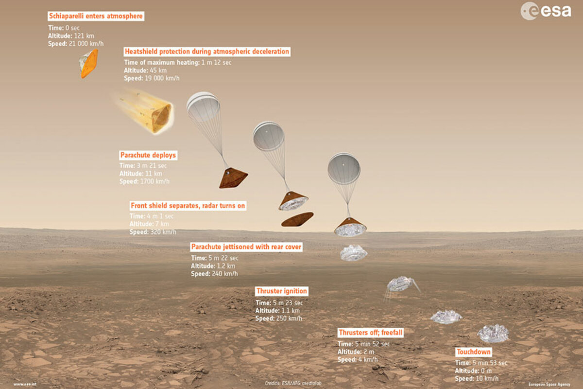 Another 40 seconds later, Schiaparelli will shed its front shield. And after the capsule slows to a speed of about 155 mph (250 km/h), the back half of the aeroshell 鈥 the part that has the parachute attached to it 鈥 will be tossed off, leaving the surface platform to land on its own.