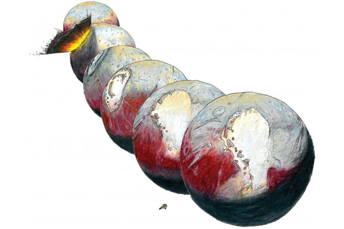The researchers suggested that the impact that created the basin weakened the crust overlying a buried ocean, causing some of the water to rise close to the surface. This action, along with the deposition of nitrogen ice in Sputnik Planitia, would have created enough of a "positive mass anomaly" to roll the dwarf planet, Nimmo and his colleagues wrote.聽