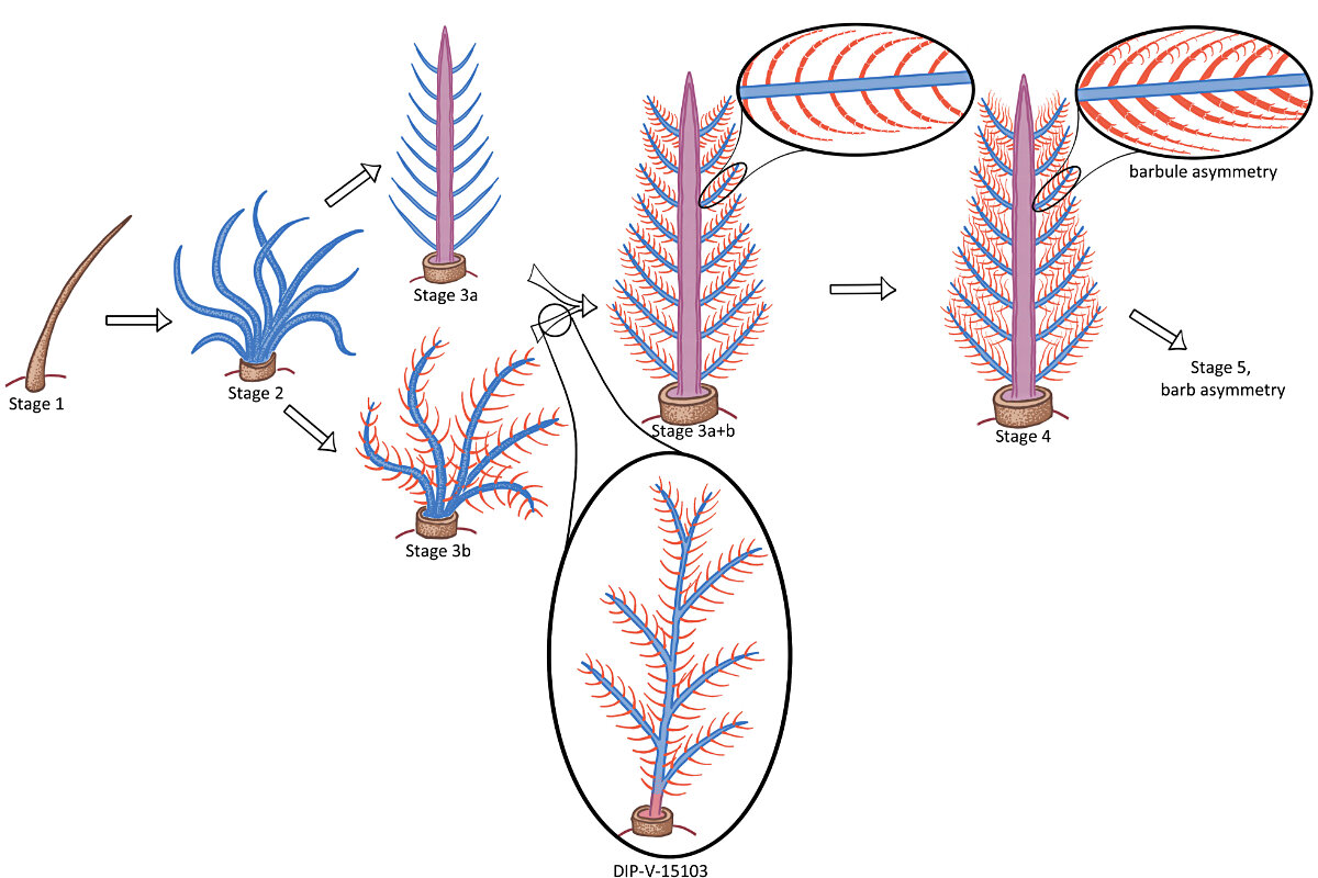 Stage 3 is broken up into stage 3a and stage 3b, separate versions which later merge to become stage 3a+b. In stage 3a, a central rachis has formed with barbs coming off it in a series, but no barbules. Stage 3b sees barbules, but no rachis. Stage 3a+b sees feathers with a rachis, barbs, and barbules, but the barbules don't interlace. Stages 4 and 5 see the complexity of the barbules increasingly becoming like the feathers seen on birds today.