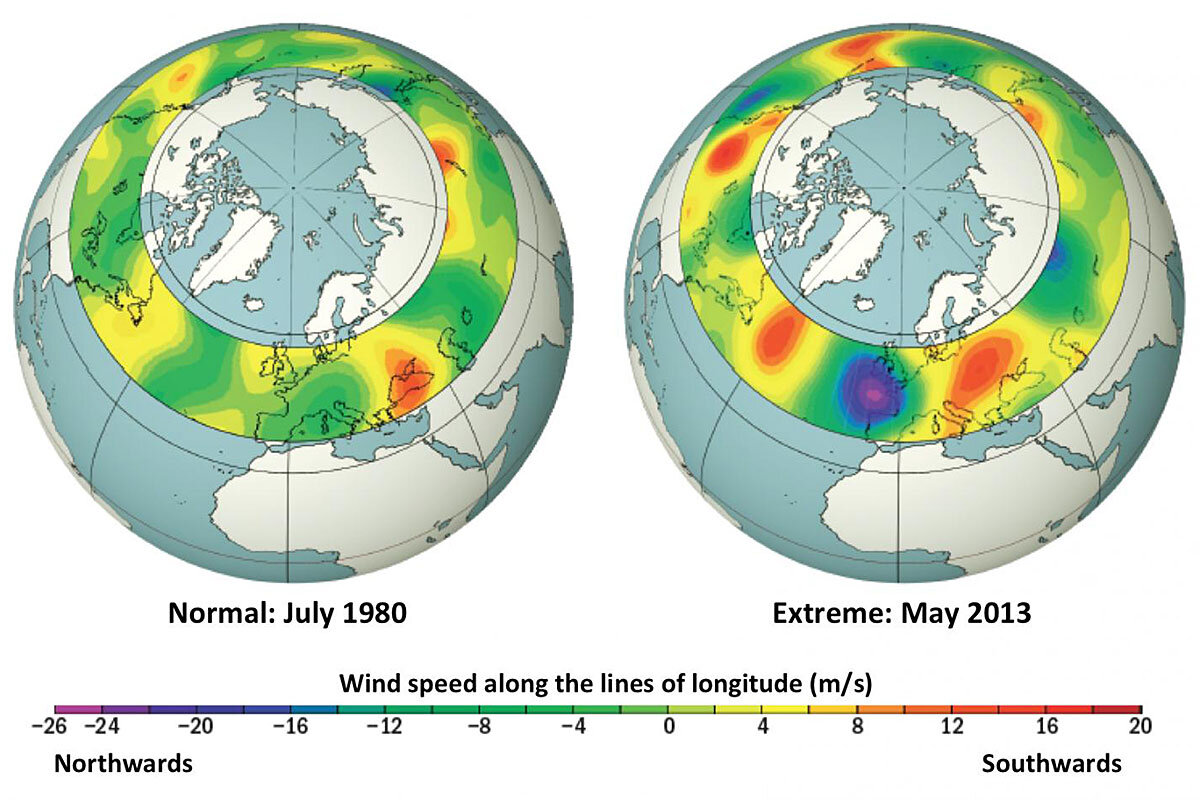 The eastward-flowing air isn't one completely steady band. Slow-moving waves that travel from north to south often appear across the ribbon of air. It is those particularly large undulations, called Rossby waves, that researchers link with extreme weather, because of the intensely low or high pressure systems they bring with them.