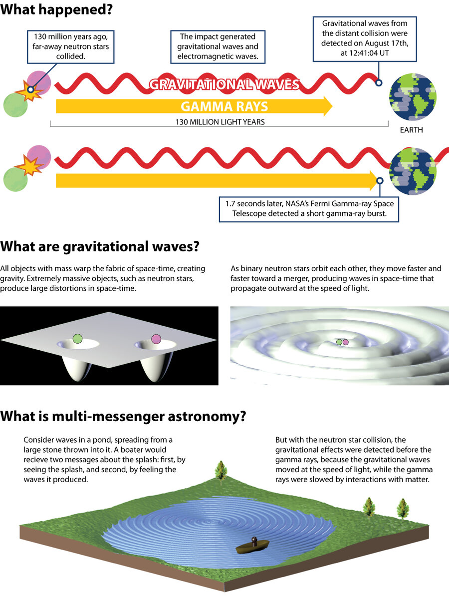 Some 130 million years ago, two neutron stars drawn into a gravitational dance with each other collided. This violent merger shook the fabric of space-time and sent fireworks of electromagnetic radiation out into the universe. On August 17, scientists detected the gravitational waves of this stellar event, and then less than 2 seconds later spotted a gamma-ray burst coming from the same location. Over the next few days, both Earth- and space-based telescopes picked up signals from across the electromagnetic spectrum emanating from this same event.
