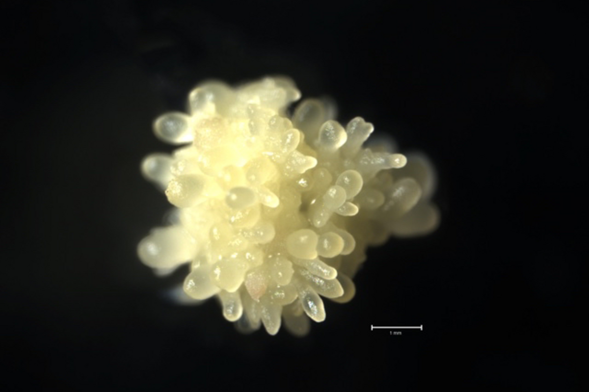 At the lab, the trees are reproduced asexually, first by cracking open the nut and removing the embryos from the tip of the nut. These embryos are cleaned and then placed in a petri dish containing a nutrient-rich gel, where, if all goes well, they will multiply. Like growing plants, they are repotted into new petri dishes with new nutrients every few weeks as they grow and, eventually, sprout.