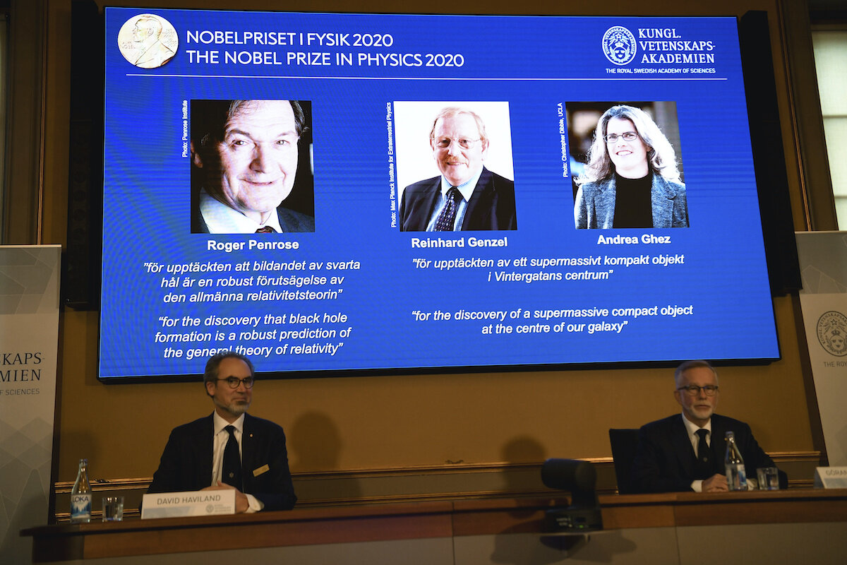 Briton Roger Penrose received half of this year鈥檚 prize 鈥渇or the discovery that black hole formation is a robust prediction of the general theory of relativity,鈥 the Nobel Committee said.