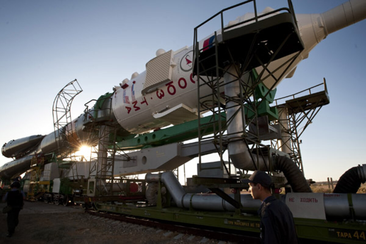 The Russian spacecraft set to carry a new crew to the international space station is transported from a hangar to the launch pad at the Russian-leased Baikonur Cosmodrome in Baikonur, Kazakhstan, , 2010.