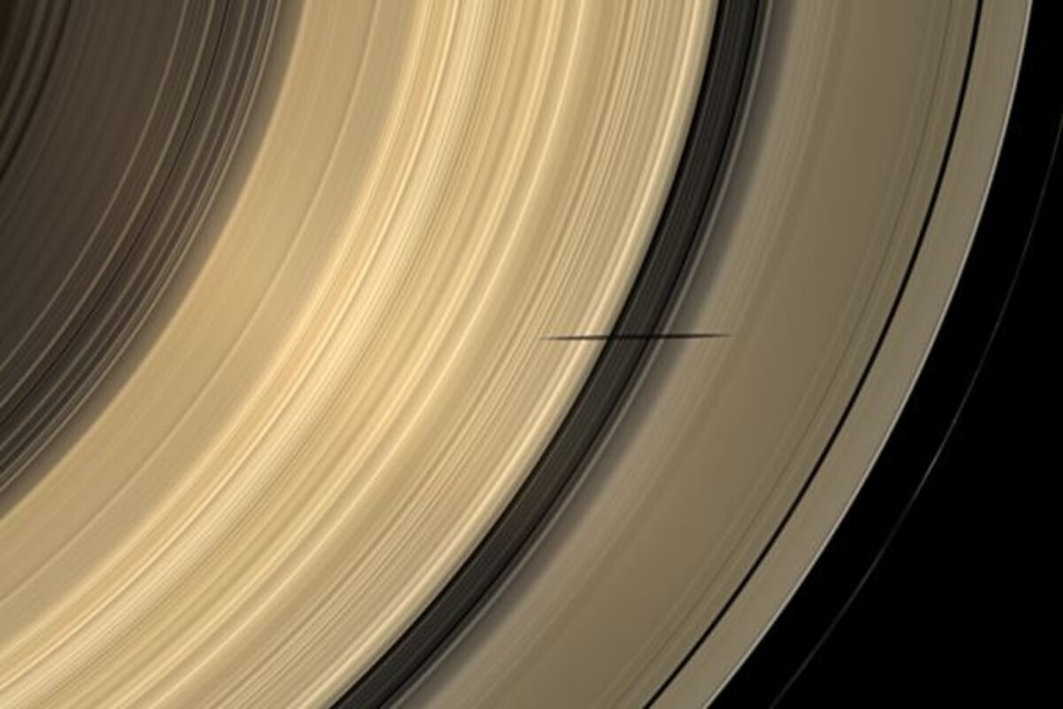 As Saturn approaches its equinox, the hardy obiter is sending back one image after another that provide stunning views of the rings, moons, and in this rare case, the hint of a moon's presence from its shadow.
