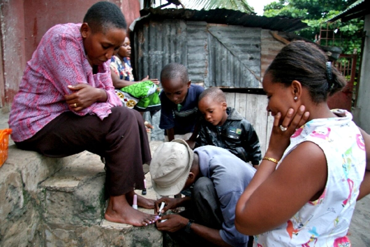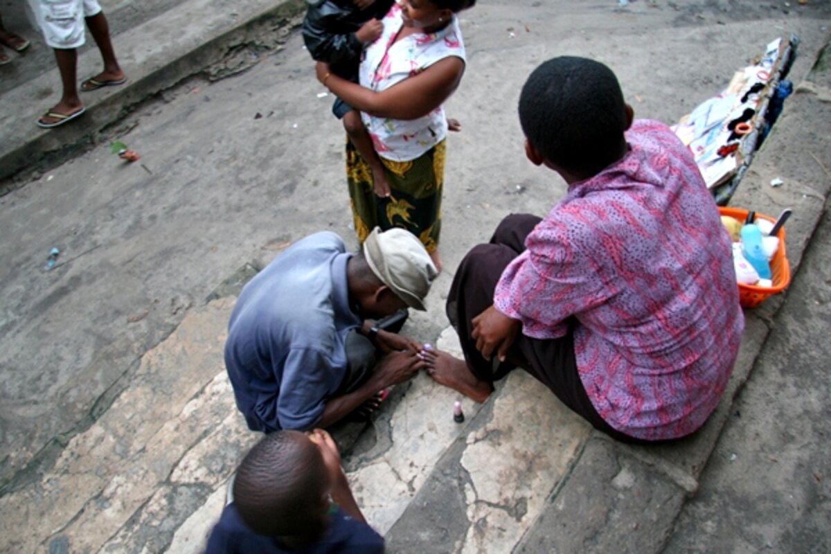 Aloisia, our interpreter, Neema, Briton - "Tony" to his friends, I've discovered - and I trooped outside. And there "he" was: a tall fellow in a boating hat with a small Tupperware container packed with remover, cotton, and polish. We plunked down on the dirty steps of Neema's building, and he painted our nails right there, to the delight of a cluster of neighbor kids.