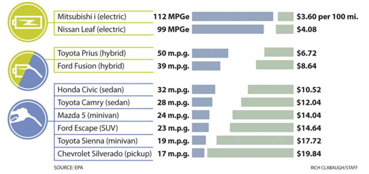 For example, take the 2012 Chevrolet Volt, which offers all-electric driving with a gasoline tank as backup. Its EPA label touts both 37 m.p.g. and 93 MPGe. Those are strong numbers for either mode, but how much cheaper is one mode than the other? Check the fine print. It says that the Volt takes 36 kWh of electricity to drive 100 miles. Or, when you switch to gasoline, it's 2.7 gallons per 100 miles. Now it's just a simple calculation.