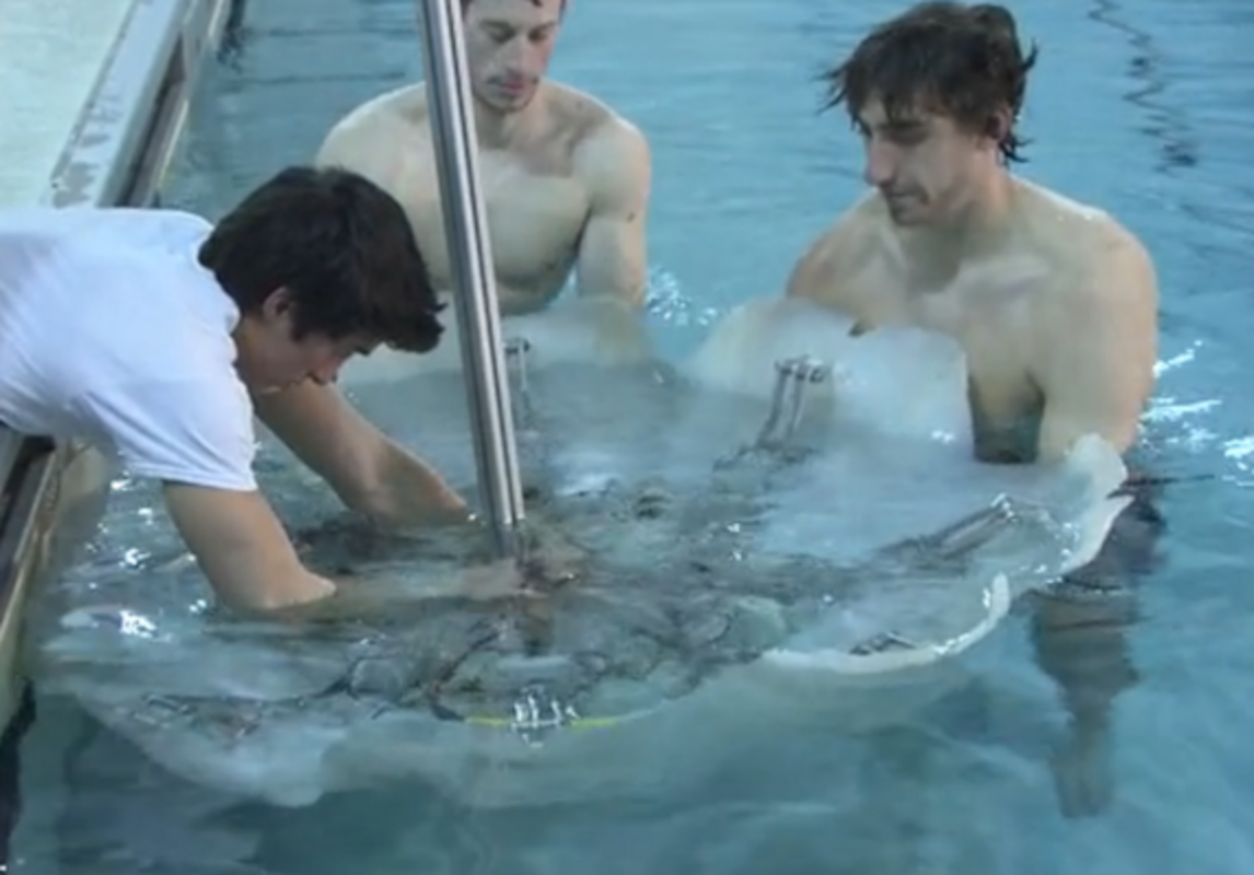 to the Los Angeles Times, engineers at a Virginia Tech lab are working on a giant, synthetic, robo-jellyfish, which one day could autonomously patrol the high seas. The project, which is funded by a聽$5-million grant from the US Naval Undersea Warfare Center and the Office of Naval Research, has already yielded one workable prototype: a 170-pound monster nicknamed Cyro.聽