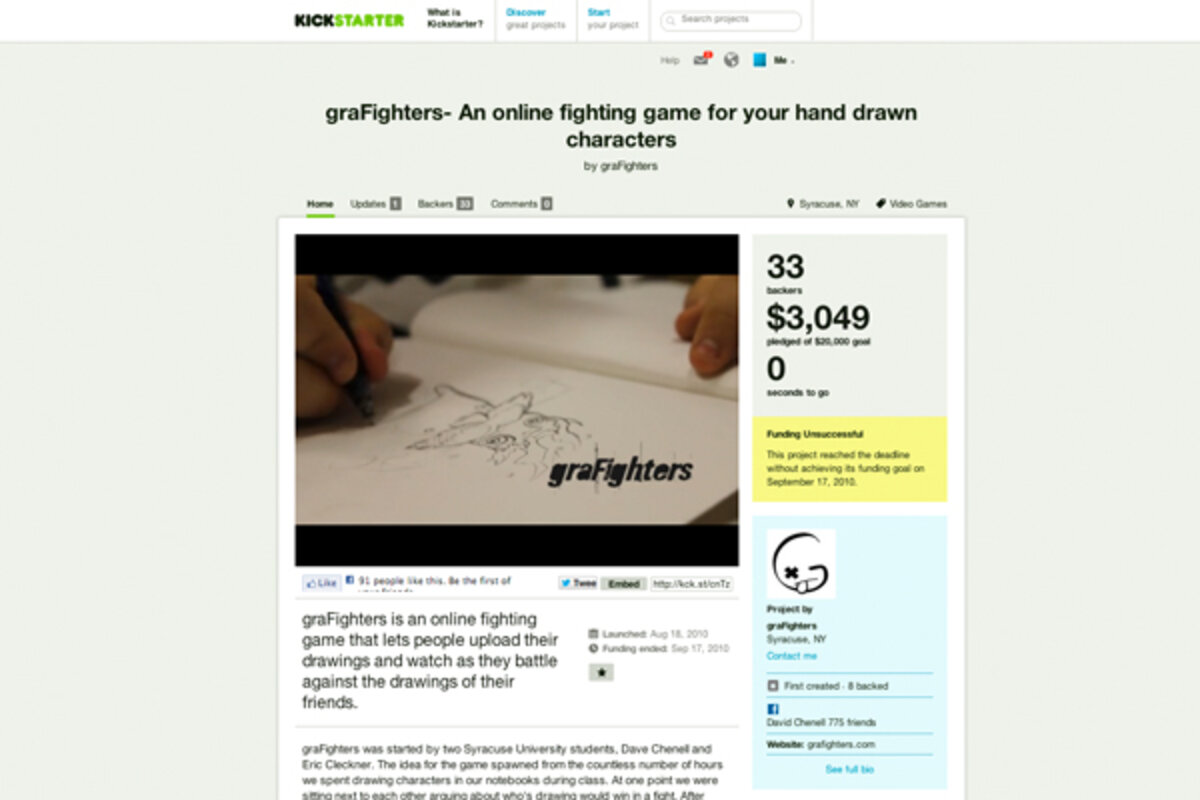 Mr. Cleckner and Mr. Chenell turned to Kickstarter, launching their campaign in August 2009. Grafighters got the attention of some backers and even the staff at Kickstarter, but it raised only $3,000 by its deadline, far from its goal of $20,000.