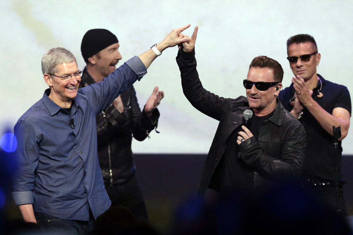 The Irish band played at聽Apple's聽event and CEO Tim Cook announced the new album would be given to the company's 500 million iTunes users. A news release says the album will be released to everyone else Oct. 14.