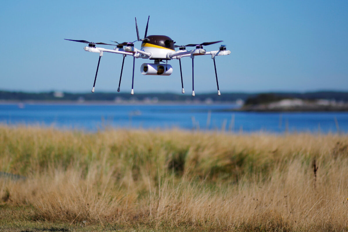 The drone, painted UPS-brown and carrying a small package, flew from from coastal Beverly, Mass. to Children's Island in just eight minutes, a three-mile journey that takes half an hour by boat.听The test across open water to the site of a children's YMCA camp was聽one of the first forays into how drones could be used to quickly deliver emergency supplies to rural and hard-to-reach areas.