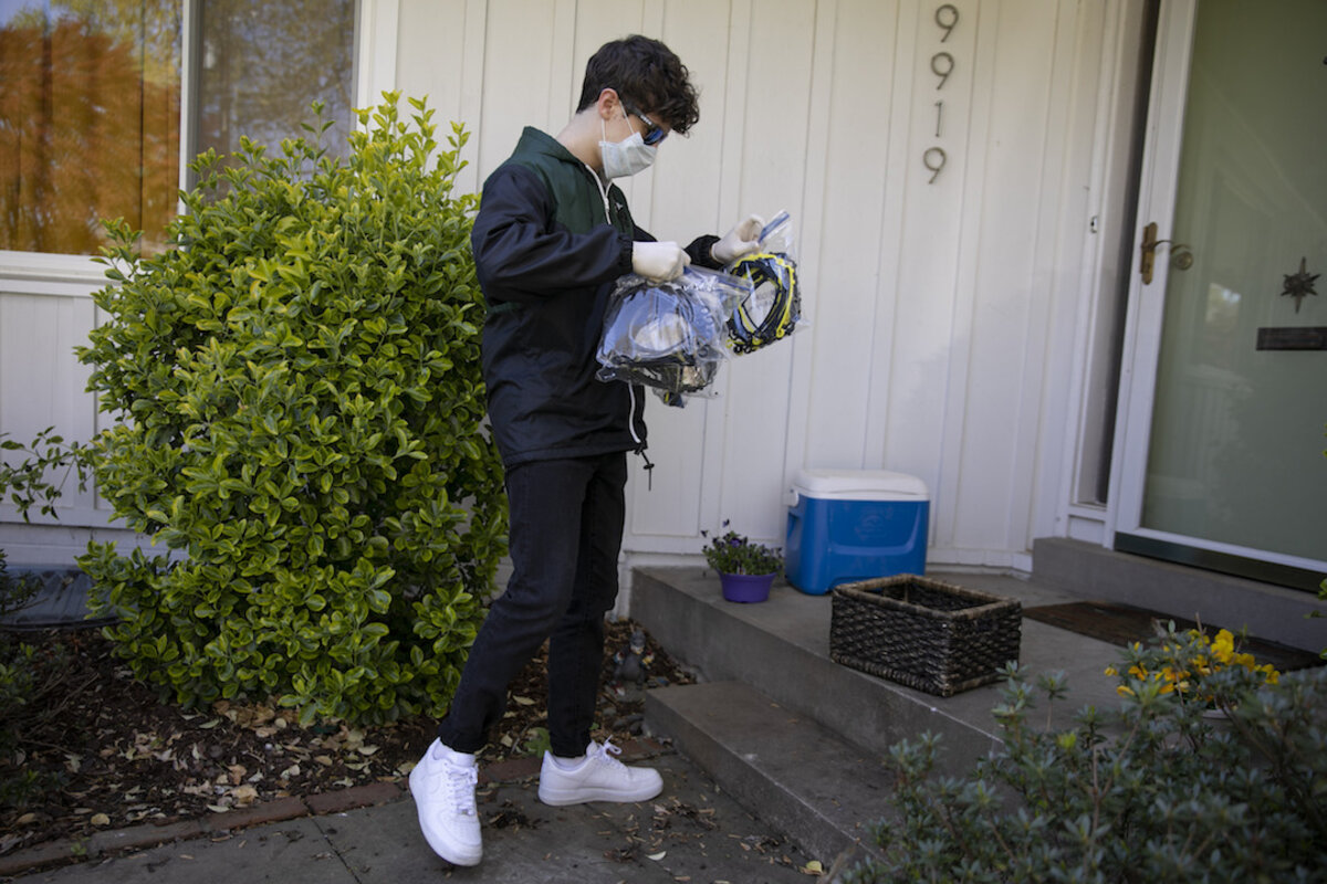 Twice a week, volunteer drivers such as William Olsen gather up the printed materials from people's homes. To maintain social distancing and reduce personal interactions, residents leave the newly printed parts in a sealed bag or box on their porches.