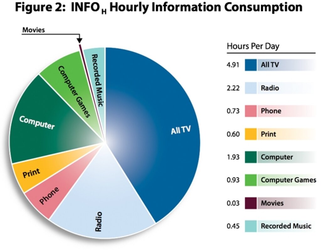 How did the researchers come up with these astronomical figures? They crunched numbers on US consumption of TV, radio, telephones, print, computers, video games, movies, and music.