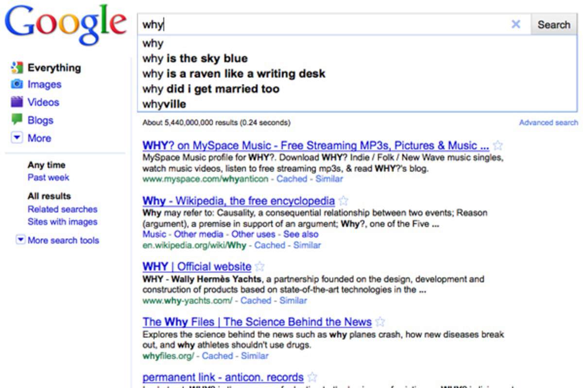 That drop-down list is nothing new for Google 鈥 and comes standard features with Yahoo and Bing. Each search engine has compiled these suggested terms based on historically popular queries. Type "why" in Google and you'll see that the most common "why" searches are "why is the sky blue" and "why is a raven like a writing desk." (The first has to do with the separation of light coming into the atmosphere; the second is a nonsense riddle from "Alice's Adventures in Wonderland." Don't take our word for it. Do the search yourself.)