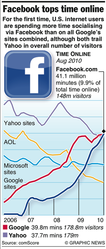 A caveat: When we say Google, we're also saying all the Google sites, including Gmail and the movie site YouTube, which makes Facebook's achievement look even more impressive.