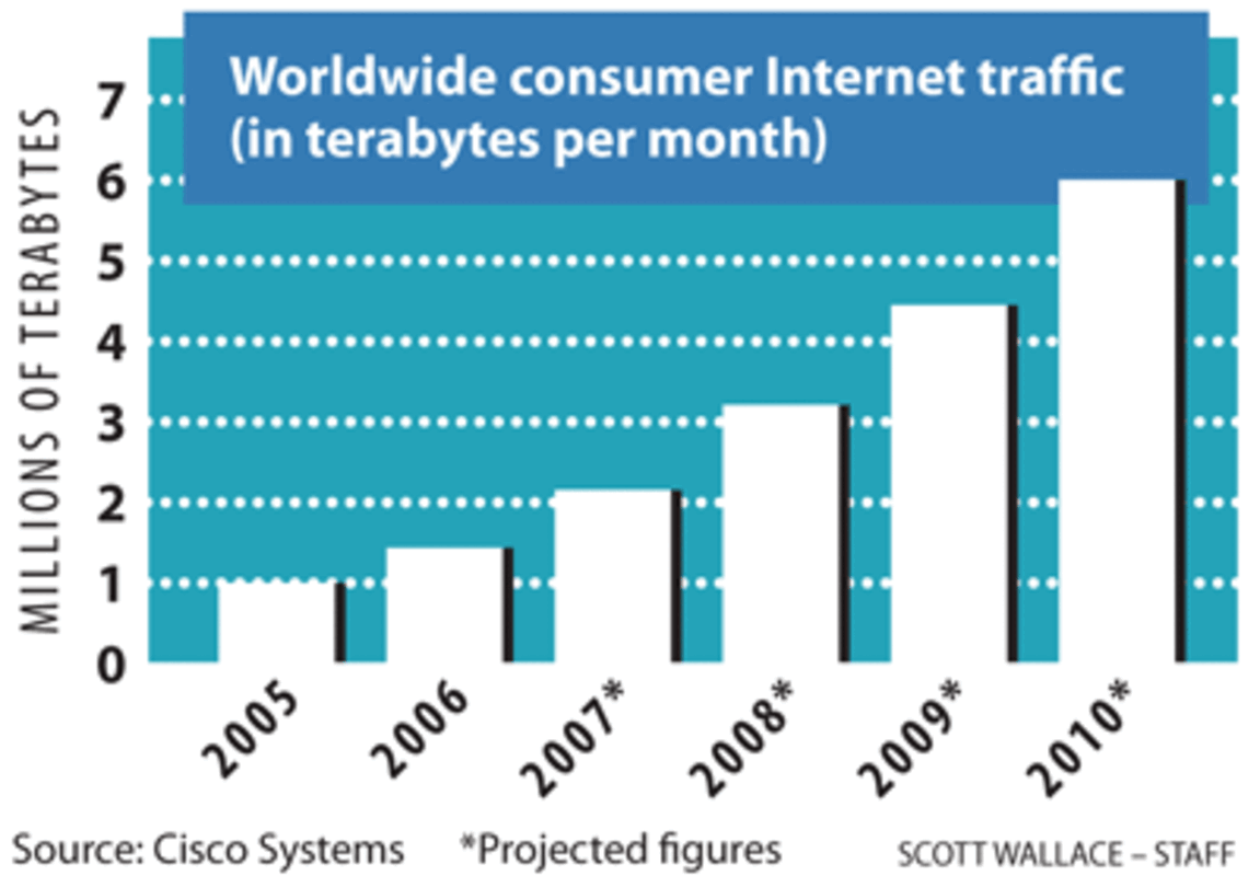 Rising consumption of Web video, and more file-sharing, will nearly double worldwide Internet traffic every two years, predicts Cisco Systems, in San Jose, Calif. By 2011, global traffic will reach 7.8 million terabytes per month. (That's the equivalent of 2 trillion songs or more than 8 trillion novels every 30 days.)
