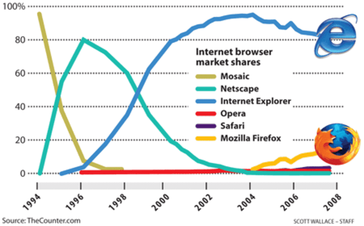 But Netscape's dominance among browsers was short-lived. In 1995, Microsoft released Internet Explorer, which came bundled with each copy of Windows. Explorer blasted from 0 to 60 percent market share in just four years 鈥 and hit 95 percent by 2002. Despite tweaks, Netscape could never keep up and has been running on empty ever since. (See chart, right.)