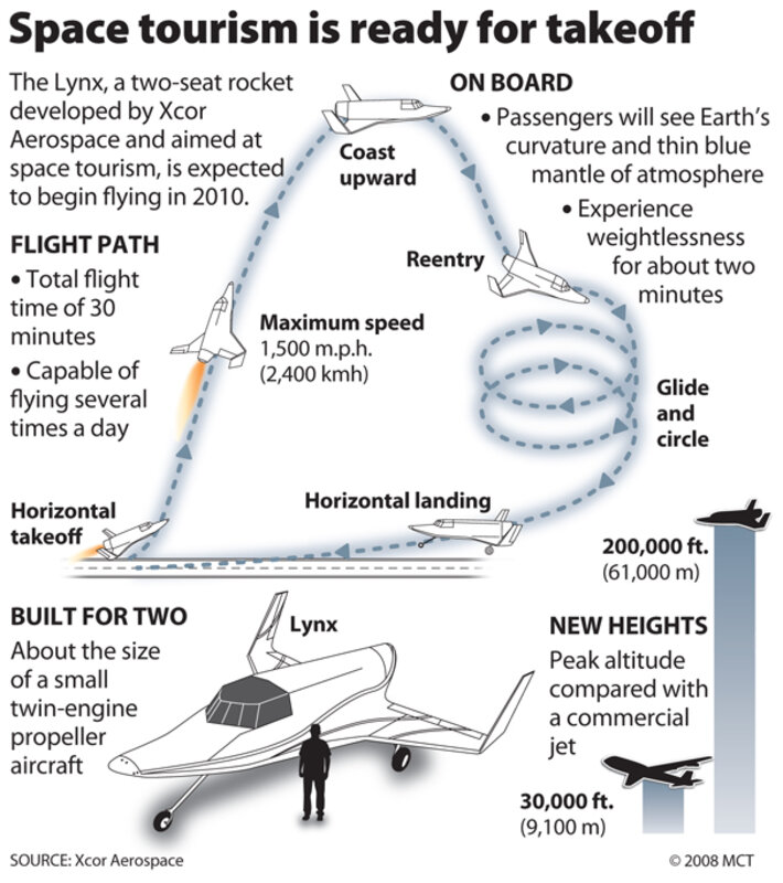 Xcor Aerospace is counting down to 2010 for the launch of its Lynx rocket ship. The two-seater tourist plane will blast toward the sky at 1,500 miles per hour. The pilot cuts the engines three minutes in and lets momentum carry the Lynx to its peak altitude of 200,000 feet 鈥 commercial jets top out around 30,000 feet. Drifting for a moment, the passenger can see the blue curve of Earth鈥檚 atmosphere fade into the black void of space. Then, gravity tugs the plane back toward reentry.