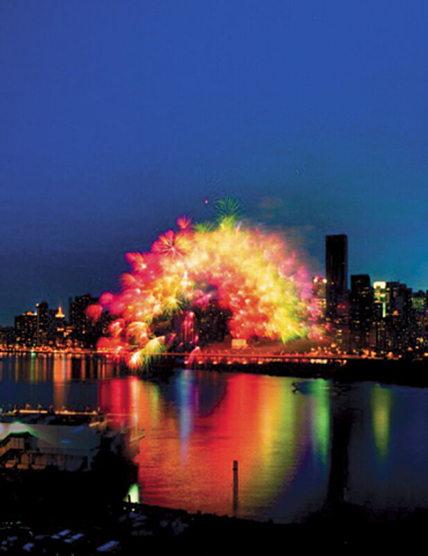The "Transient Rainbow," from Grucci and gunpowder artist Cai Guo-Qiang, forms a 300-foot arch of colored bursts. One thousand shells fire in just 15 seconds. With computer-assisted timing, the group can place each of its seven different colors perfectly in space, as if using pixels to create a full picture.