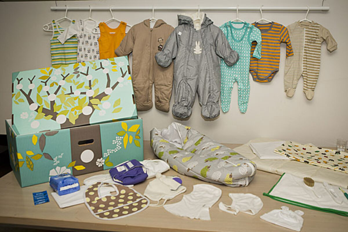 The brightly colored cardboard box doubles as a cot, complete with mattress and sheets, and contains numerous baby items including a sleeping bag, jump suits, socks, pants, hats, bonnets and diapers. Maternity packages have been given to expectant mothers in Finland since 1938.