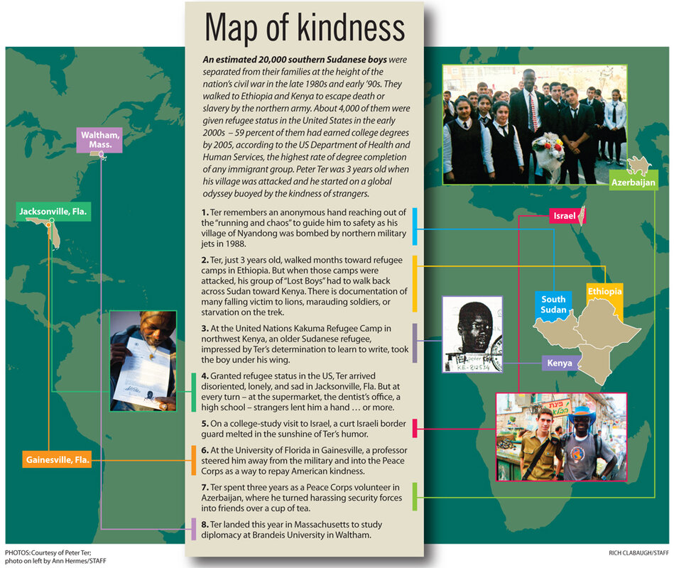 One day, Ter says, he might return to Sudan to see his biological family. But at the moment his life is here, and he wants to live in the present and future, not the past. Ter today is a graduate student at The Heller School for Social Policy and Management at Brandeis University in Waltham, Mass., where he is working toward a dual master's degree in sustainable international development and in coexistence and conflict resolution.