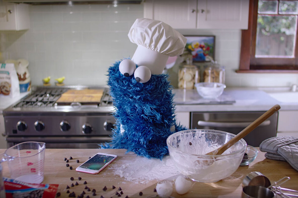 The ad聽聽of his trademark cookies into the oven, then asking Siri 鈥 note the monster hands-free use of Siri 鈥 to set a baking timer. Siri plays the cookie fiend his "waiting playlist" to ease the strain of waiting for cookies and generally shows off her enhanced ability to understand people who speak with an accent.聽