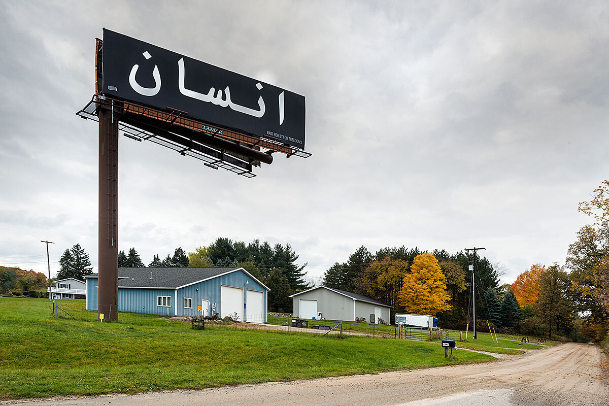 One black-and-white billboard displayed the Arabic words for “human being.” Created by artistJamila El Sahili, it towered over voters in Michigan, one of two states that went on to elect the first Muslim women to the US Congress.