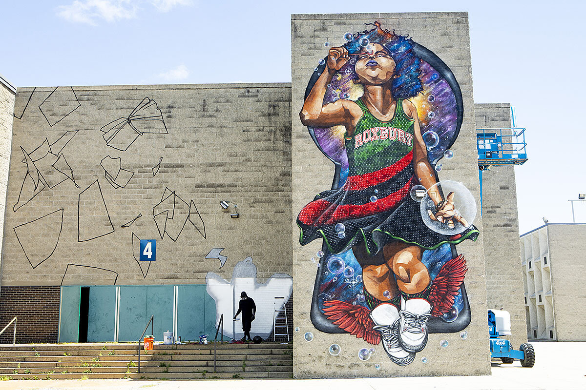 He starts painting at 5 a.m., racing against the sun. From atop his forklift crane, Rob 鈥淧roBlak鈥 Gibbs 鈥 one of Boston鈥檚 foremost graffiti and street artists 鈥 resumes work on a multistory mural at the Madison Park Technical Vocational High School. As dawn glistens on nearby skyscrapers, he observes nature鈥檚 daily shift change as bats cede the sky to birds. The artist鈥檚 thoughts flit to his 2-year-old daughter as his spray cans rattle and spit. She inspired his mural of a young Black girl floating above the ground with wings on her sneakers.听