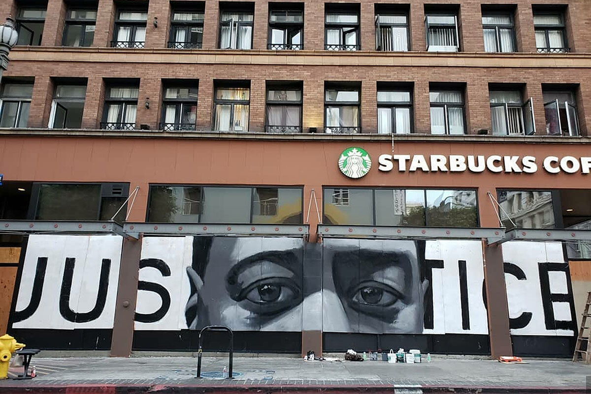 Days later, when the ransacked Starbucks across the street from him erected wooden boards to cover its broken windows, Mr. Vargas saw an opportunity to turn a 鈥渂lack eye for our community and a bit of an eyesore鈥 into a positive message. He used the planks as a canvas to paint the word 鈥淛ustice.鈥 The word is split into two. Mr. Floyd鈥檚 eyes sit between the two fragments.