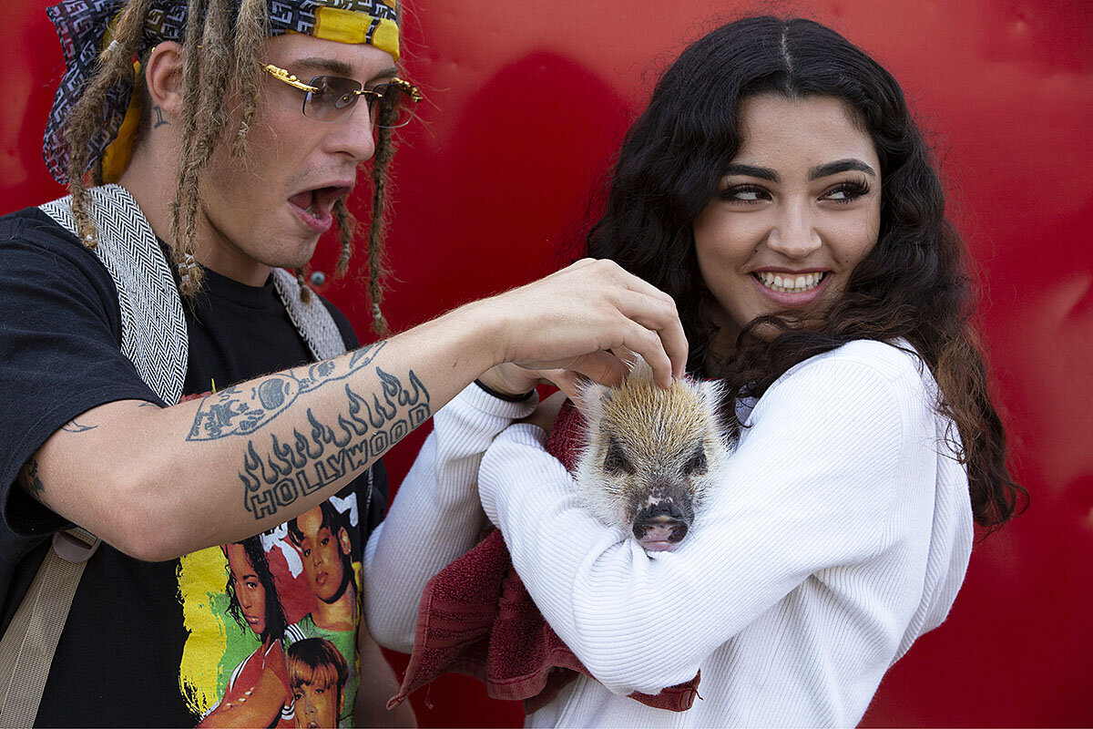 Now, standing outside the enormous聽apple-red trailer that houses pigs and people, he grins in that Southern California light that makes every hour golden hour, and says, 鈥淚 do love to race pigs.鈥