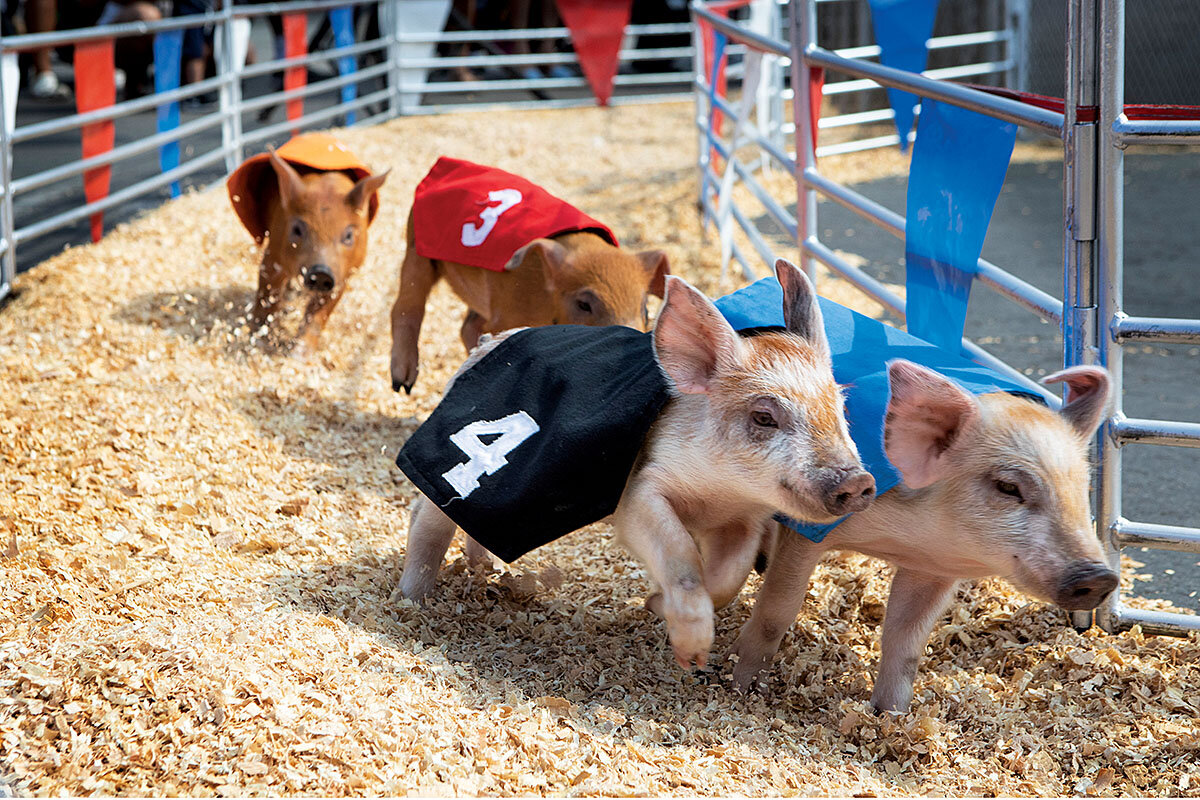 We aim for the exit, but the river of people has other ideas. Somehow we鈥檙e sweeping again toward the pigs. The 8 p.m. show is about to begin, and even from far away you can see the grandstands are now overflowing. There are baby strollers, wheelchairs, children on their parents鈥 shoulders. As we walk, we鈥檙e passed by a little girl tugging her mother in the direction of the tiny arena. 鈥淢ommy, are they going to race? Is that where they鈥檙e going to race?鈥