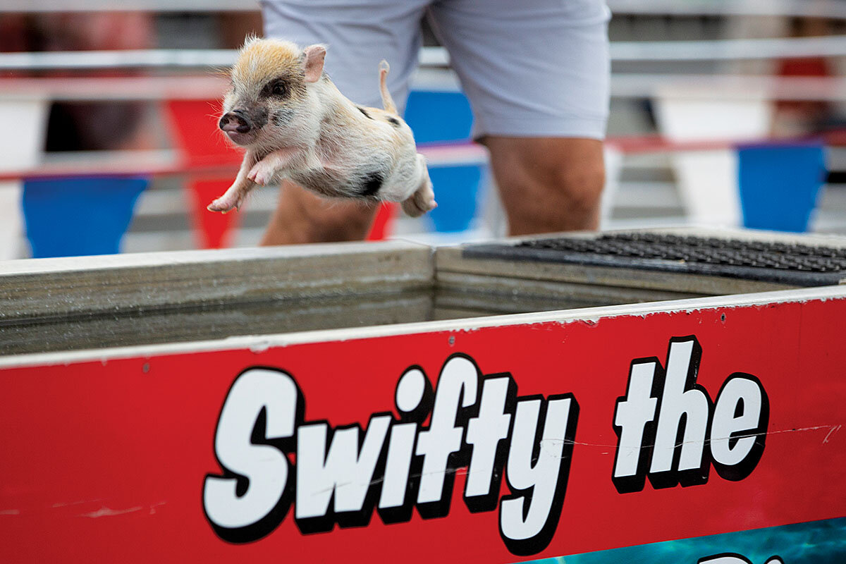 Now it鈥檚 showtime again. The pigs race. (This time it鈥檚聽Kardashing-ham, by a snout.) And then out comes Swifty, ready to fly into her stainless steel water trough. In truth, Swifty is more of a swimmer than a flyer. Still, there鈥檚 a moment 鈥 your heart jumps at it 鈥 when she leaps from her platform and has nothing below her but sky. Then she splashes into the trough and paddles across it at speed.聽