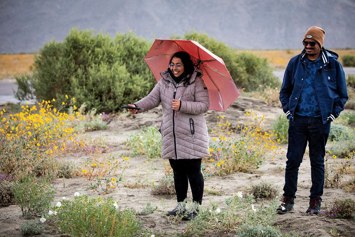 鈥淚 have more flowers in my backyard!鈥 Ms. Mittal told me, laughing from beneath her umbrella. Still, cheerful patches of color dotted the valley floor, including yellow desert sunflower and purple verbena.