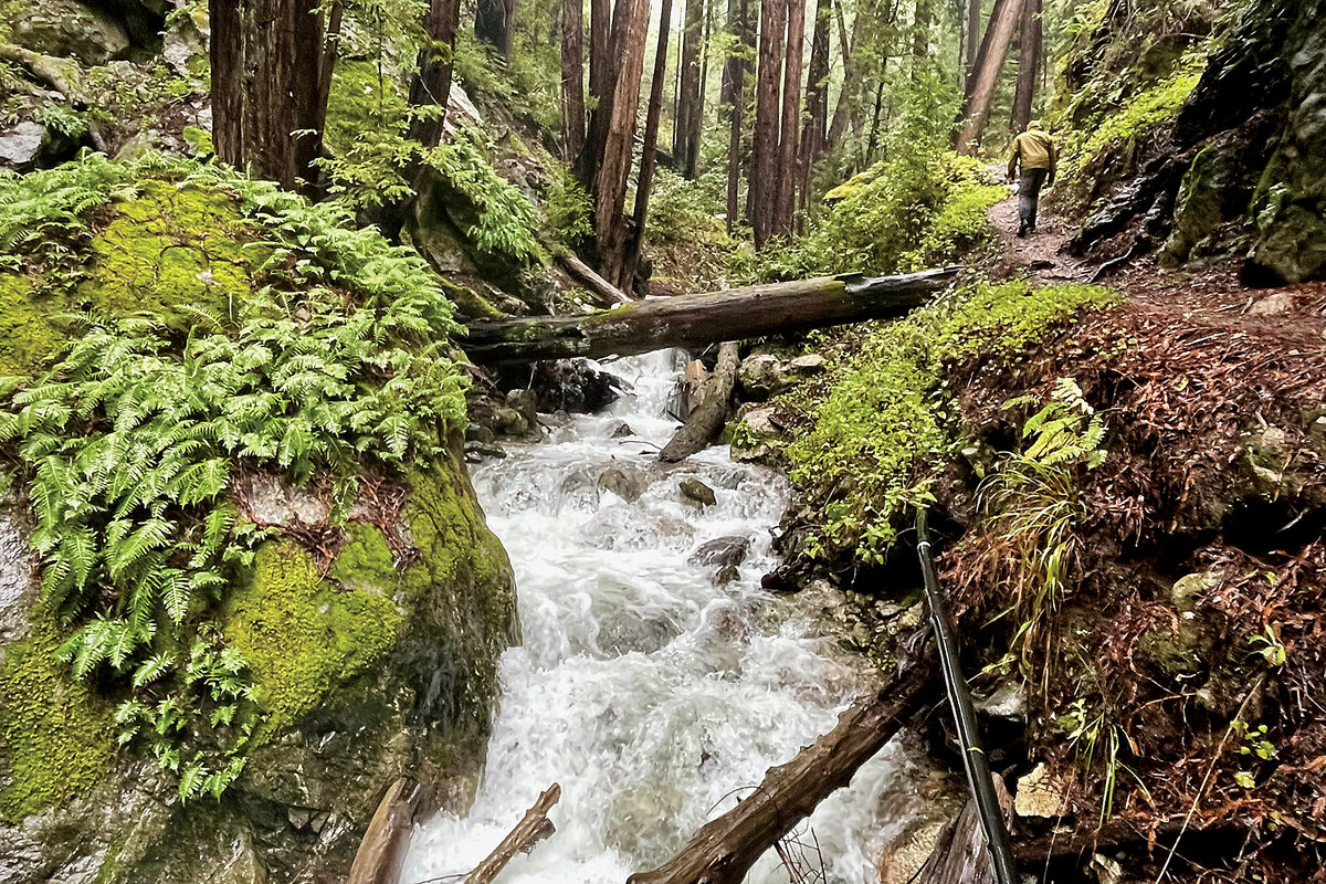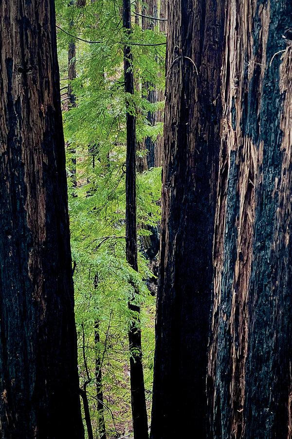After crossing a short wooden bridge, we walked beside a rushing stream that ran through a canyon. We climbed through a grove of ancient redwood trees, their branches and leaves forming a high canopy above us as a soft rain fell. Instead of the grand landscapes I might have photographed on a bright day, I now relished zooming in on the smaller elements of nature juxtaposed with the towering trees.聽