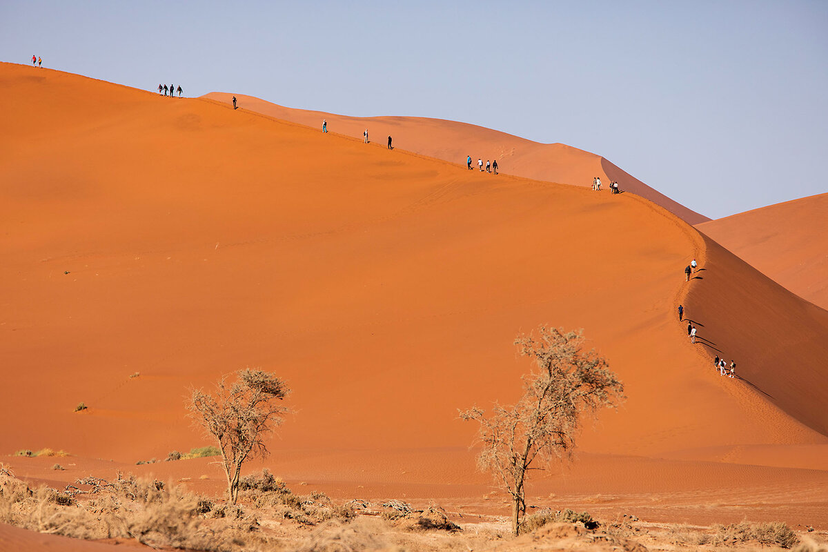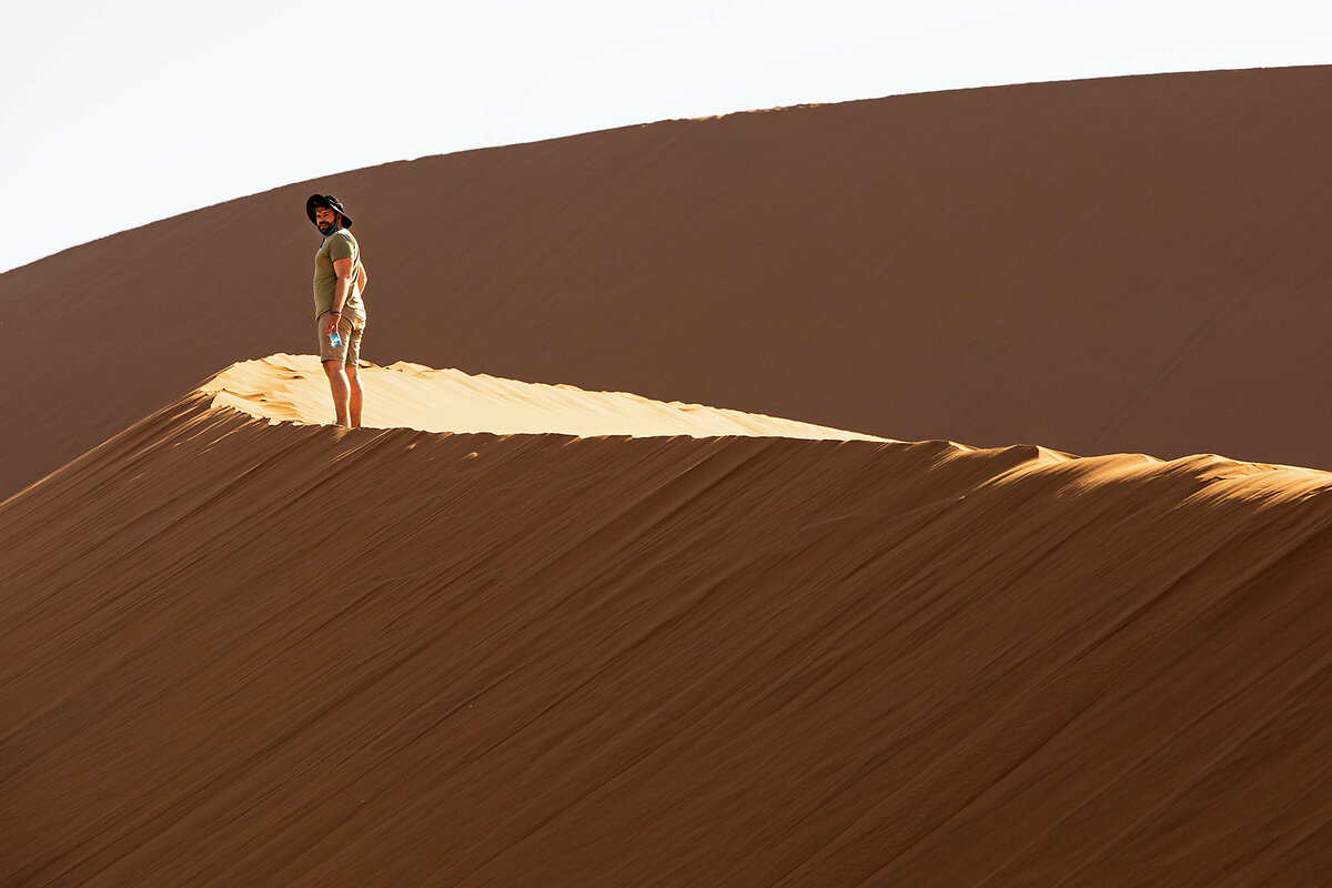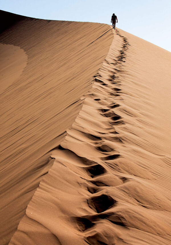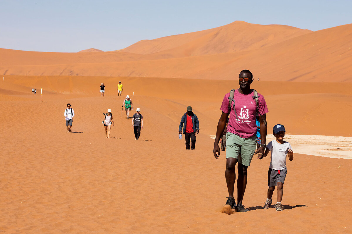 His name is Kasiki Sigberth Kanyanga, and he says to call him Siggy. Just before sunrise, Siggy is leading us on a bus tour through the Namib-Naukluft National Park in Namibia. Like the busloads of tourists whizzing past us, we are impatient to get to the base of the dunes. If we are early enough, there will be breathtaking views of impossibly high mounds of sand set against the breaking day.