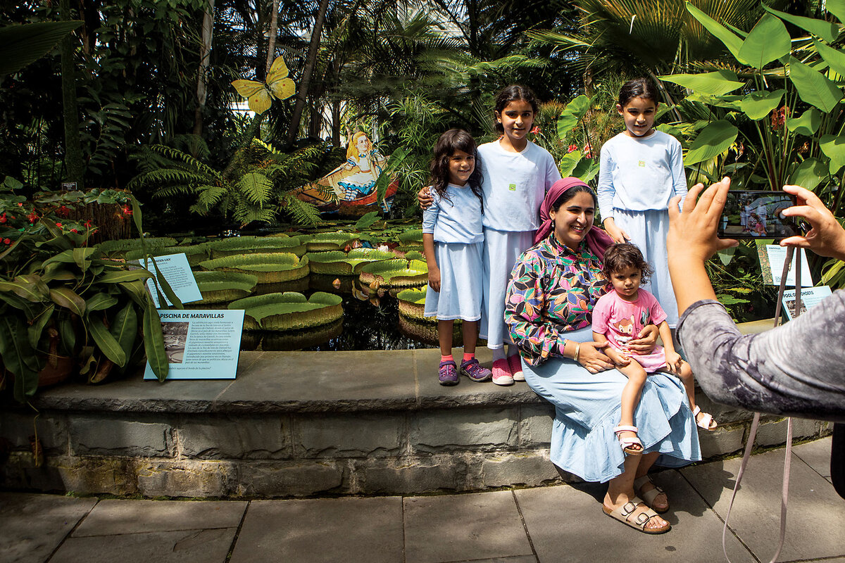 Diana Dil poses for a photo encircled by her little girls, all in blue except for the youngest in pink. Behind them, the conservatory pool is filled with giant water lilies. A multicolored Alice peeks out from the foliage in the distance. The family has excitedly visited the “Wonderland” exhibit twice.