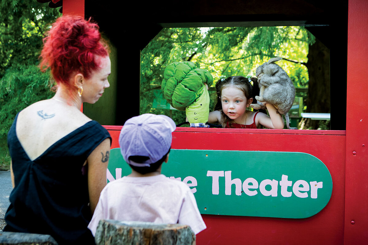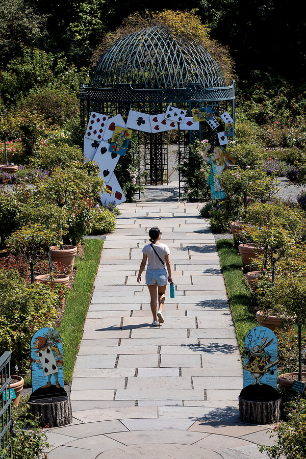 Installations inspired by Lewis Carroll’s beloved children’s books are sprinkled throughout the 250-acre garden as part of the “Wonderland: Curious Nature” exhibit, which runs through Oct. 27. Inside the garden’s conservatory are many plant specimens appropriate to Carroll’s Victorian era. Leaves of elephant ear plants, already large, can grow as big as umbrellas.