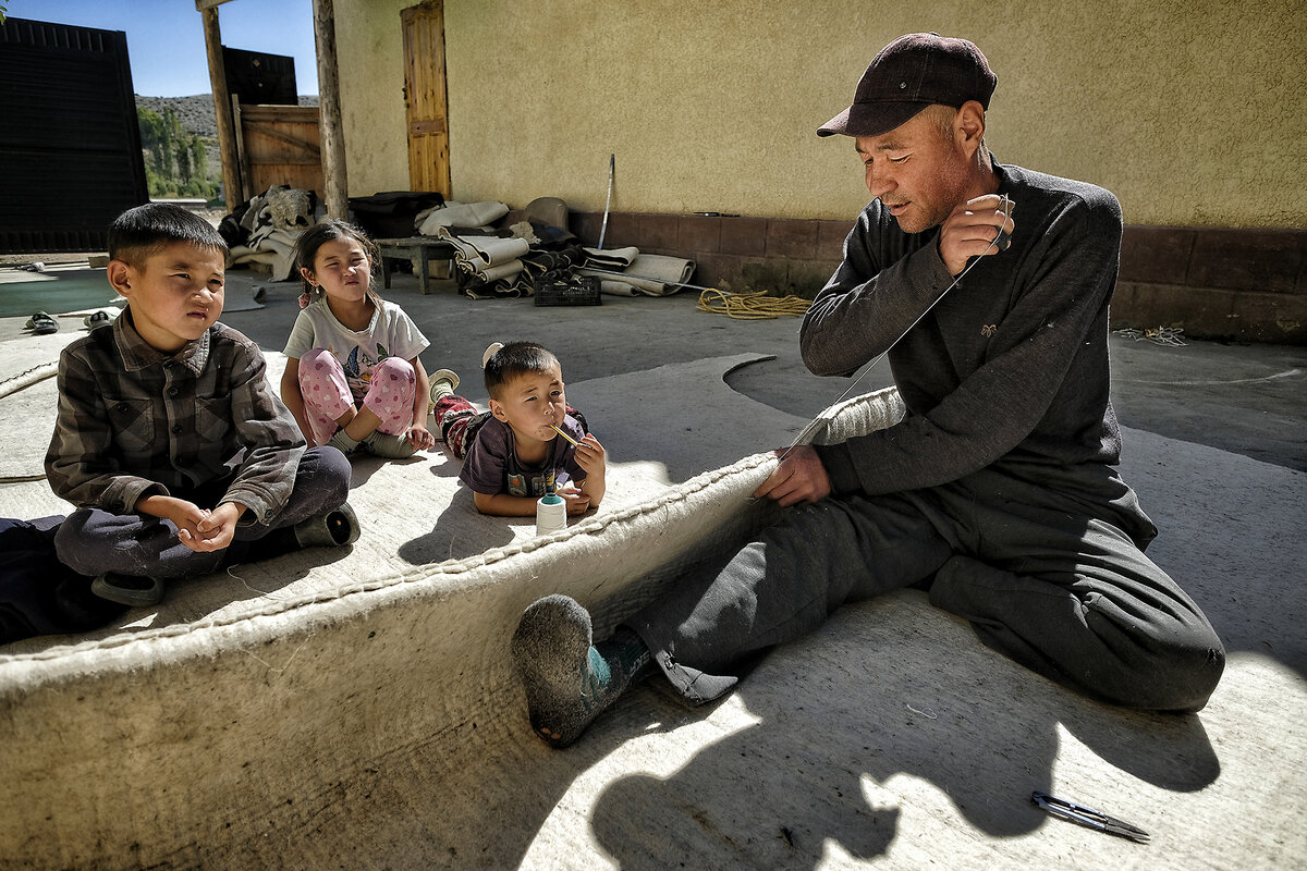 In the large courtyard of his home on the main street, Kurmanbek Achemob is shaping a wooden pole that will form the skeleton of a yurt. 鈥淢y father taught me the trade when I was a child,鈥 the third-generation yurt-maker says proudly. He works with his wife, Nazira, and hopes that at least one of their three sons will continue the family tradition. It takes the couple about two months to make one yurt.