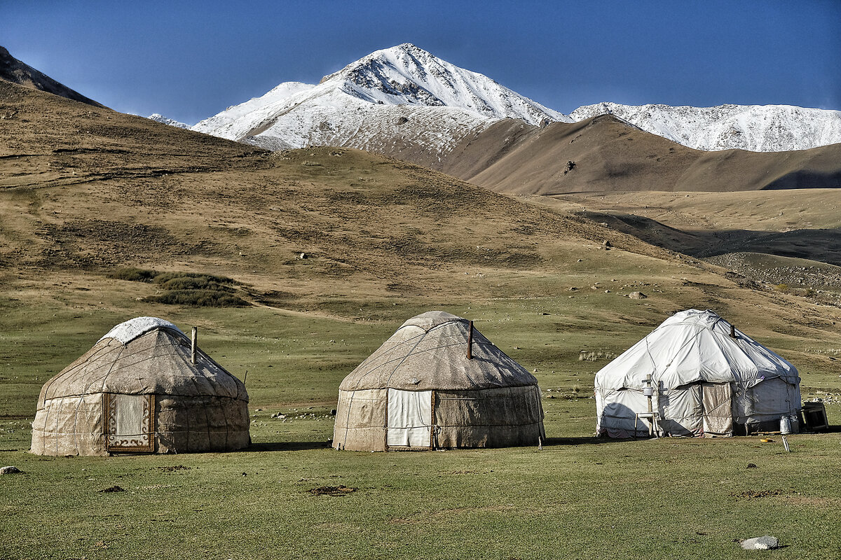 The Kyrgyz have been seminomadic for centuries, and the yurt 鈥 whose rooftop, or tyunduk, is featured on the country鈥檚 flag 鈥 is the key element in maintaining this way of life. Almost all Kyrgyz families now live in houses, but for the warmer months, many transport their yurts and their grazing animals to the mountains.