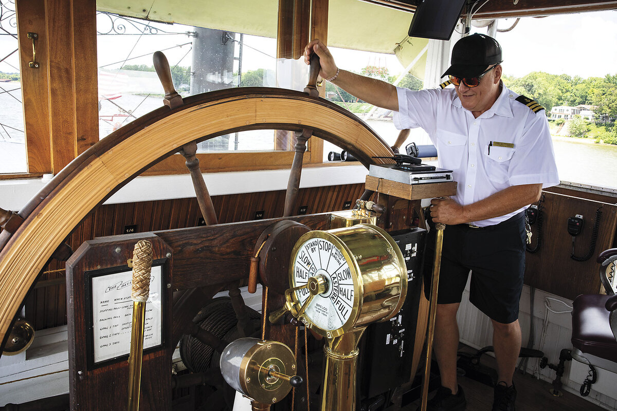 The roof-deck pilot house is more tranquil. Acting captain Eddie Mattingly describes his job as 鈥渉ours and hours of boredom interrupted by moments of sheer terror.鈥 He says he scans the river for small personal watercraft, including Jet Skis 鈥 鈥済nats鈥 who can swarm dangerously close to the vessel. Mr. Mattingly has been doing this for 45 years, so maritime safety is, quite literally, in his wheelhouse. 鈥淎s long as you鈥檙e able to take care of her, she鈥檒l keep running,鈥 Mr. Lewis says of the boat.
