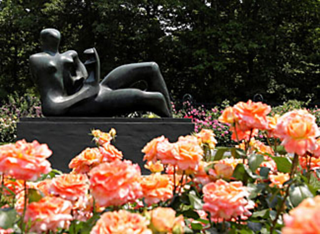 鈥or those who can't bear to be indoors, New York City offers two destinations to soak up real sunshine along with art. The New York Botanical Garden in the Bronx has 20 monumental bronze sculptures by Henry Moore scattered among its towering trees and blooming flora. "Moore in America" (through Nov. 2) presents perfectly sited examples of the British sculptor's simplified family groupings. They get a boost from their dialogue with the setting as visitors circle the pieces, touch them, and view their volumes and voids from all angles.