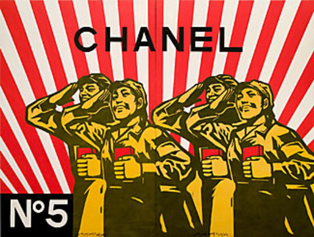 The growing consumer culture also takes a hit. Artist Wang Guangyi co-opts the image of proud workers, making them part of a Chanel No. 5 perfume advertisement. In a clever slam against both the influence of Western marketing and the Communist drive to obliterate the old, artist Ai Weiwei took an urn dating from the Han Dynasty (206 B.C. to A.D. 220) and painted the Coca-Cola logo on it.