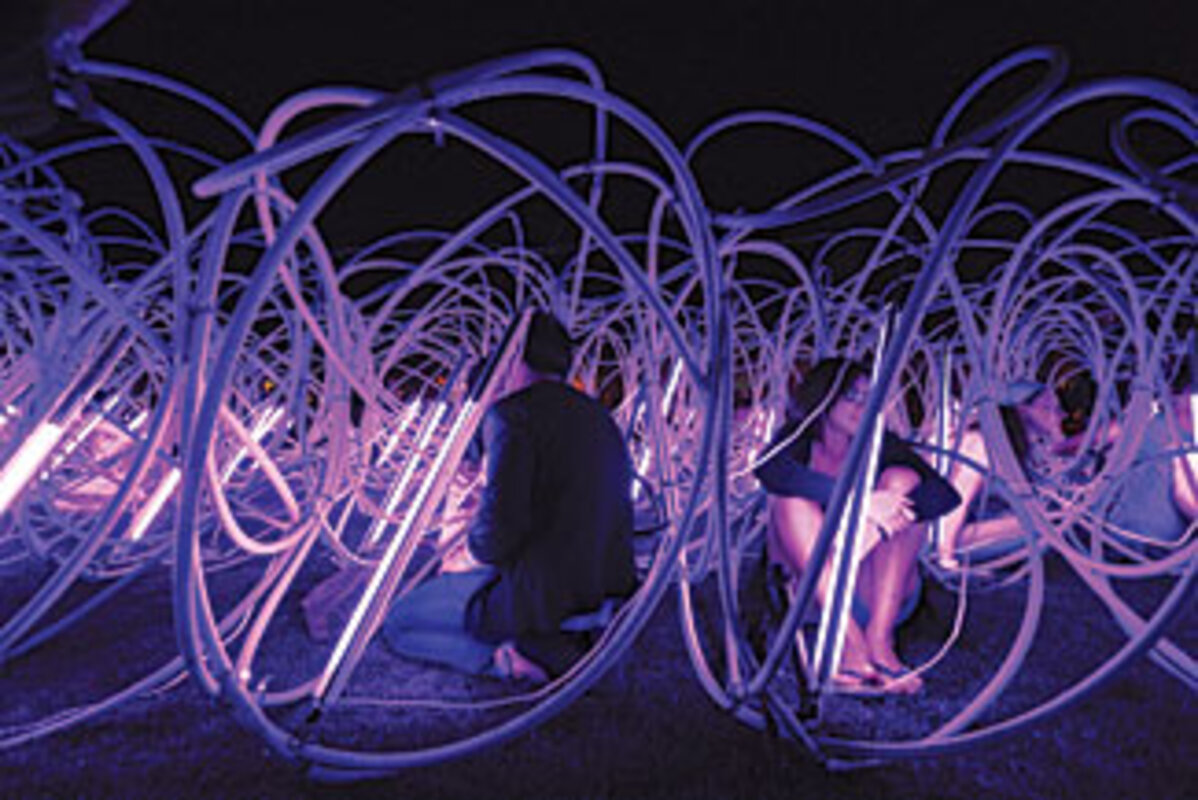 "We need both the experimental and the useful practitioners at a time like this," says Charlie Hailey, author of "Camps: A Guide to 21st-Century Space." The festival and art circuit have become rich birthing grounds for inventiveness, says Mr. Ball, who recently supervised provisional structures for the Coachella music and art festival, a three-day event in the California desert. The architect worked with a team of students at Southern California Institute of Architecture (Sci-Arc), a professional school in downtown L.A., to brainstorm artful but practical answers to the needs and wants of festivalgoers. "Elastic Plastic Sponge," an elaborate confection made of lavender- and khaki-toned PVC piping, was both an illuminated sculpture that lit up the night sky with a soft purple glow and also a misting station for parched patrons as they reveled in 100-plus degree F. heat.