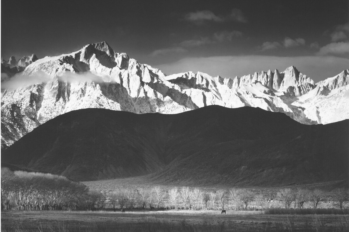 In "Winter Sunrise, Sierra Nevada from Lone Pine, California, 1944," for example, snowcapped peaks recall writings by 19th-century naturalist John Muir, a cofounder of the Sierra Club. Meanwhile, a dramatic contrast between the peaks and an ominous black foreground reflects Adams's aesthetic affinities with such fellow Modernists as the photographer Paul Strand and the painter Georgia O'Keeffe.