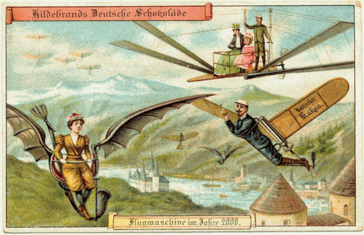A German chocolate company created futuristic postcards in 1900 of what it imagined the world would look like in 2000. The images are amusing and oddly prescient, showing innovations that are fairly true to life today, such as moving walkways, snow-creating machines, and commonplace air travel. Check them out at .
