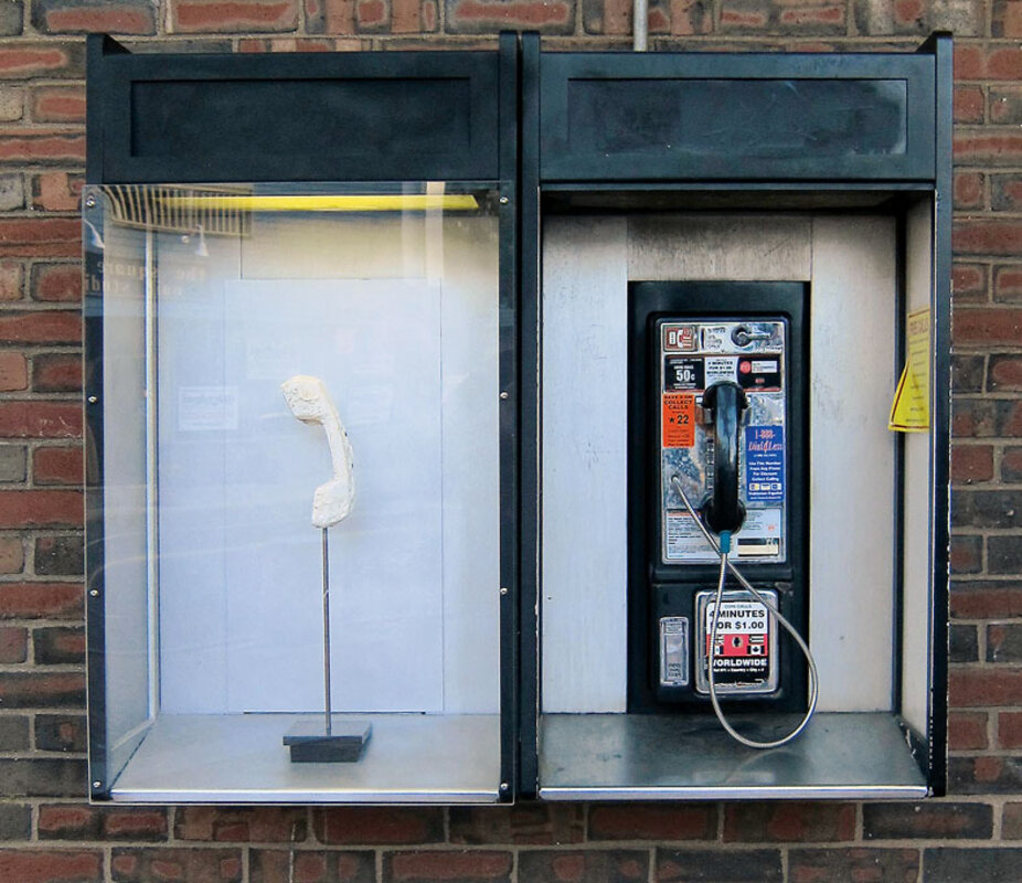 Next to them, a pair of pay phone boxes sit quietly. On this rainy afternoon, nobody so much as glances at them. But if they did, they might notice something peculiar. Inside one of the boxes, an object shaped like a phone receiver but as white and porous as an ancient bone is impaled behind glass like an archaeological specimen.
