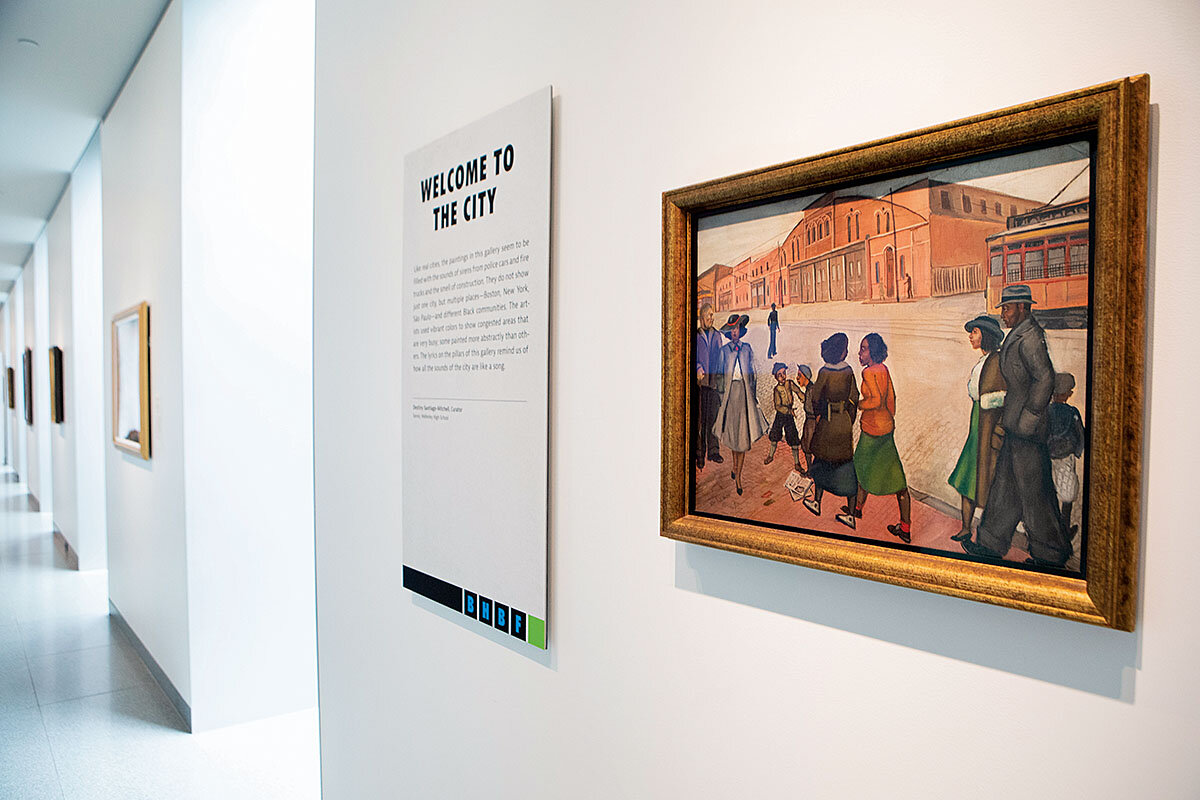 The works in the exhibit 鈥 which is expected to run through June 20, 2021, though the MFA is currently closed due to the coronavirus outbreak 鈥 are drawn largely from the MFA鈥檚 own collection, supplemented by loans from the Museum of the National Center for Afro-American Artists. (Some of the pieces can be seen in a on the museum鈥檚 website.) The exhibit is divided into four thematic sections: 鈥淯buntu: I Am Because You Are,鈥 celebrating the black community; 鈥淲elcome to the City,鈥 focusing on urban scenes; and 鈥淣ormality Facing Adversity鈥 and 鈥淪mile in the Dark鈥 both focusing on images of dignified black families before and after the civil rights movement.听