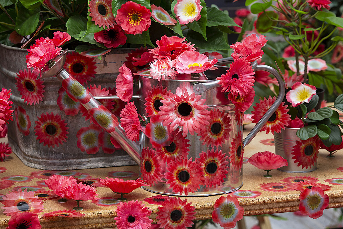 Detail of a watering can in Yayoi Kusama’s “Flower Obsession” installation. Visitors are given flower stickers to apply, which the artist expects to eventually obliterate the objects on display.