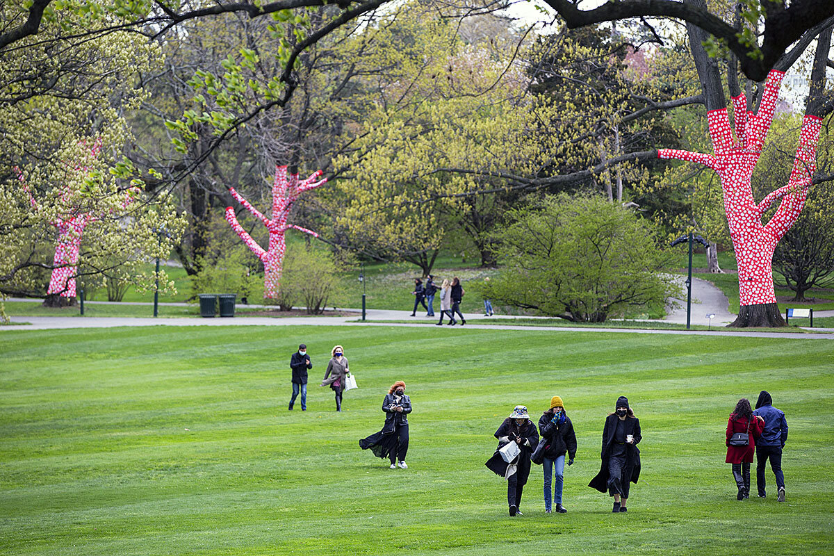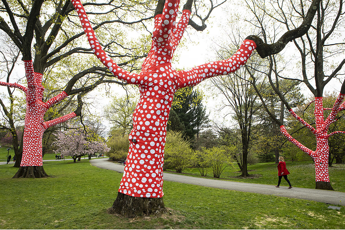 On a blustery early spring day, visitors walk across the lawn with “Ascension of Polka Dots on the Trees” in the background. The art exhibition is spread across the botanical garden’s 250-acre landscape.