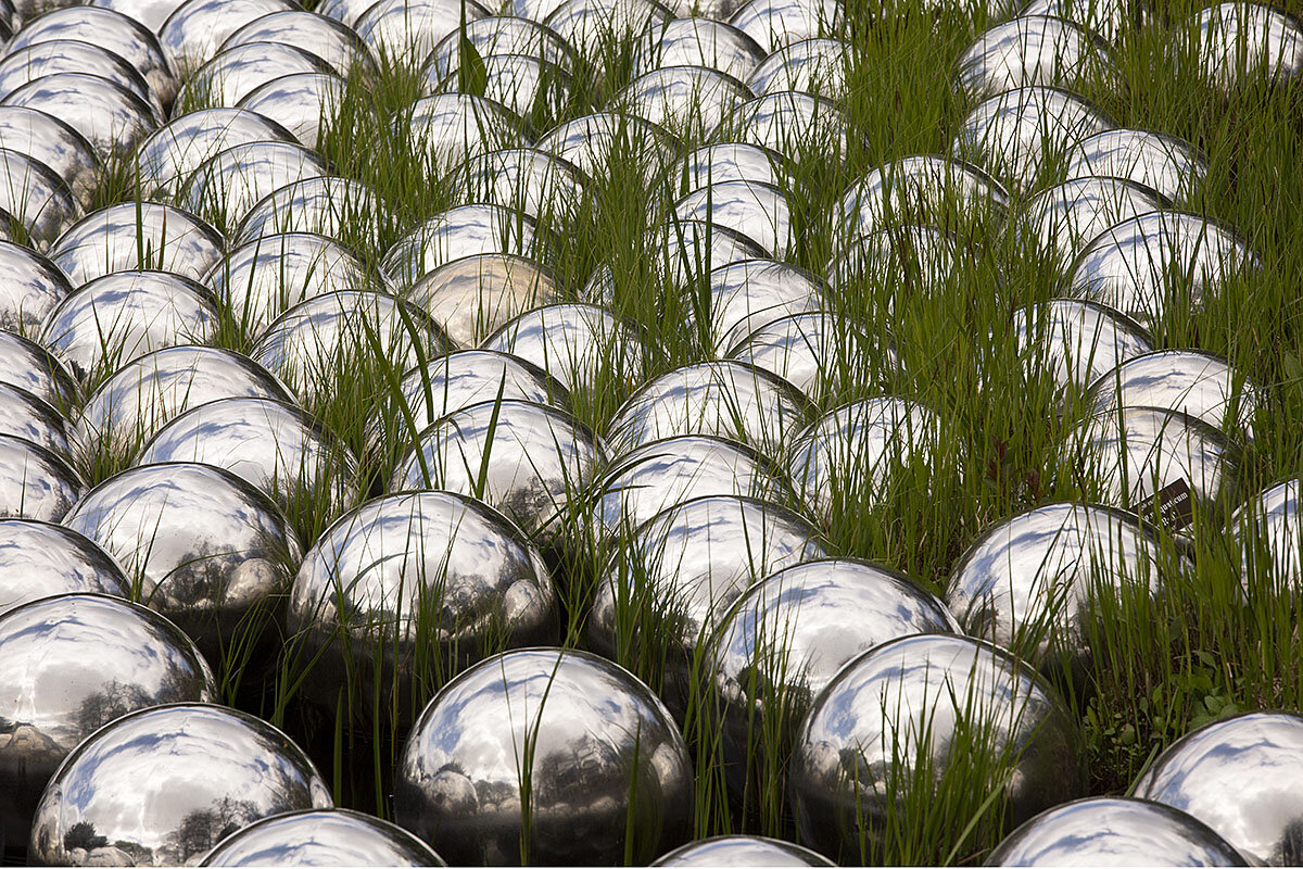 A close-up shows some of the 1,400 steel spheres in “Narcissus Garden,” installed in the 230-foot-long water feature of the native plant garden.